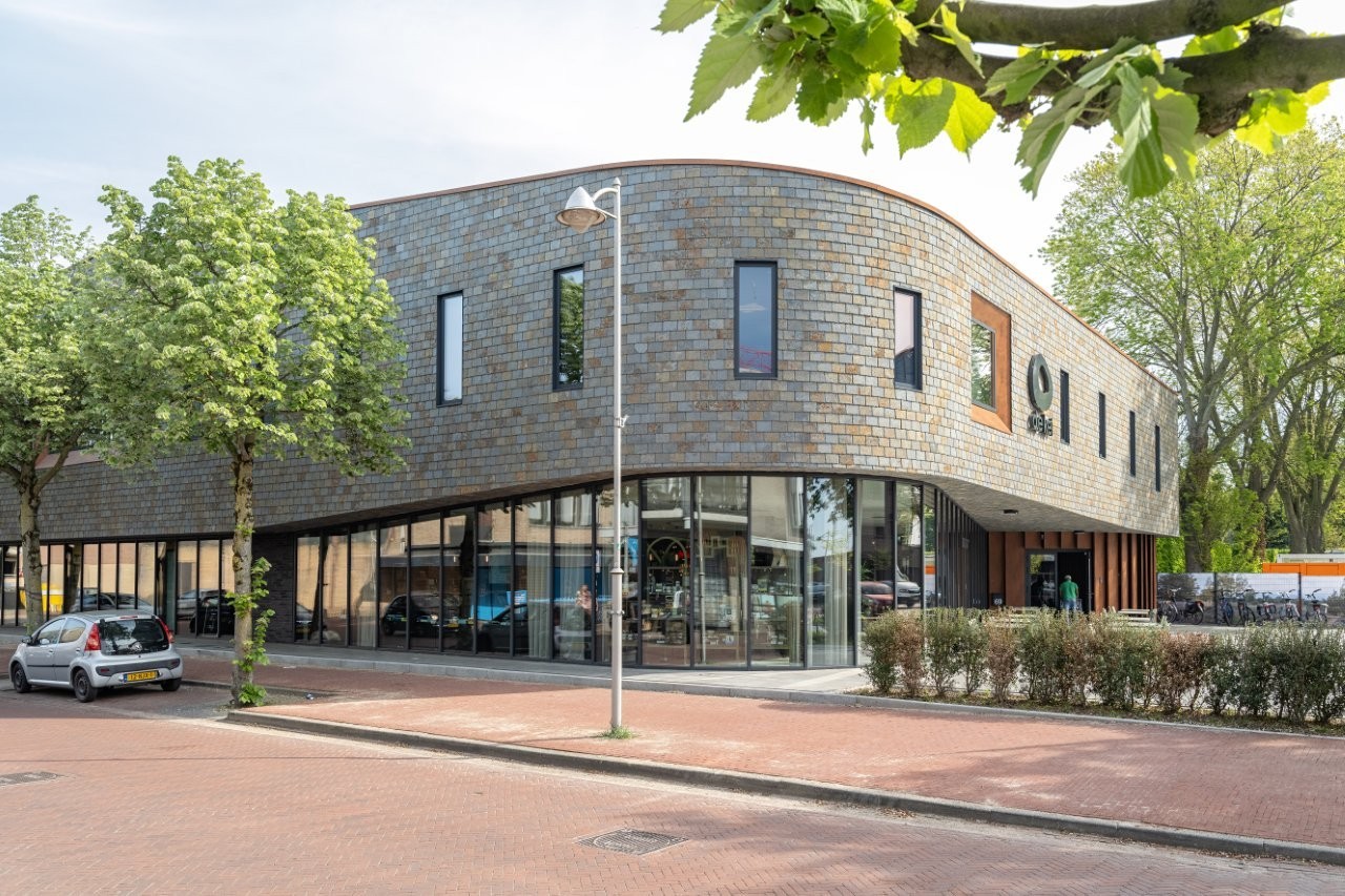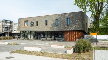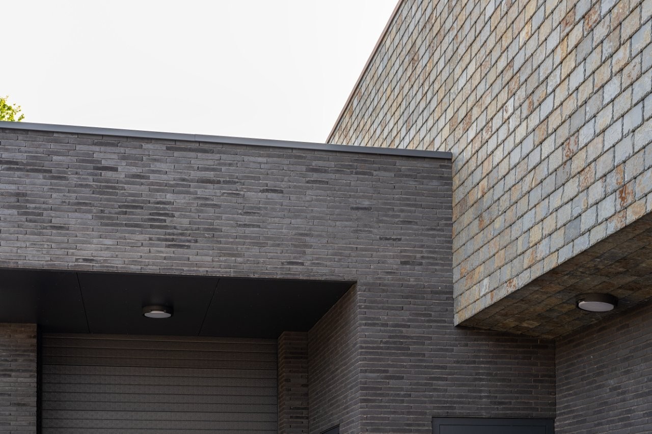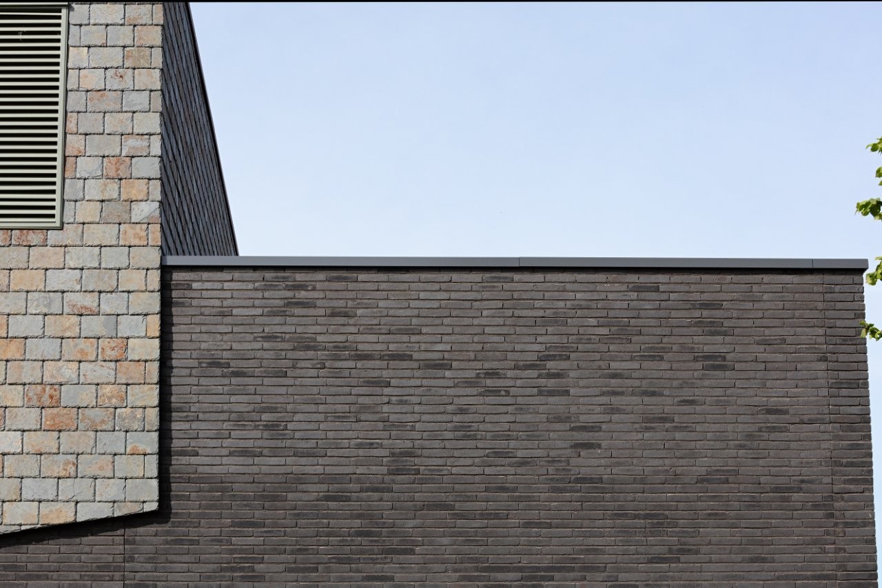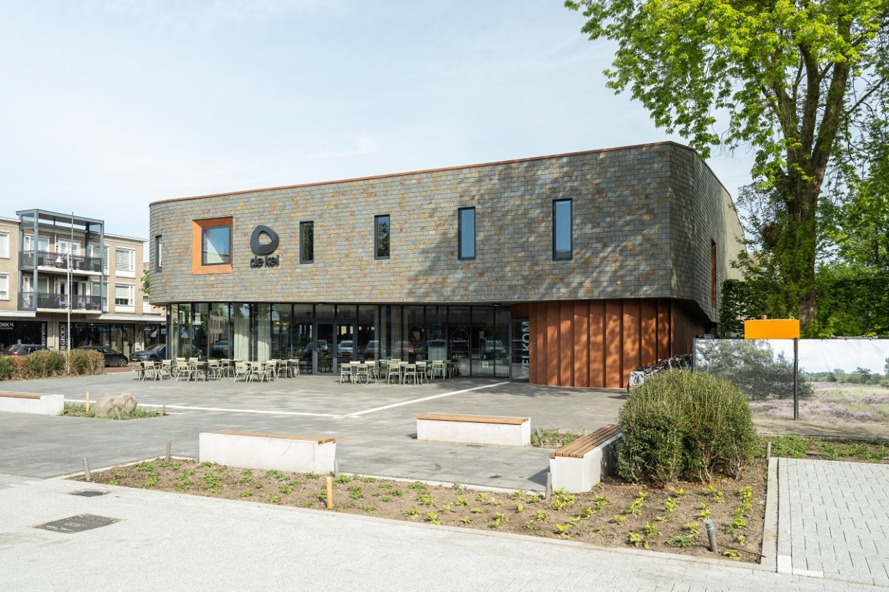 L'ancienne Kei devait être remplacée. Datée, peu de confort et un cheminement peu pratique. Pourtant, il y avait de l' émotion attachée, surtout chez les plus anciens résidents de Reusel. Le défi pour Keeris était de construire quelque chose de nouveau qui semble familier, mais qui réponde aux exigences de notre époque. « Nous voulions un bâtiment qui ait du corps. Pas une boîte anonyme, mais une Kei caractéristique qui embrasse la place. Robuste et accessible en même temps. » L'emplacement, au cœur du village, appelait un geste. Pas criard, mais confiant. Le socle transparent sur la place de l'église assure que le bâtiment « respire » avec la place. « Le foyer s'ouvre sur l'environnement. Vous voyez ce qui se passe à l'intérieur. Cela invite. » L'étage supérieur est fermé, massif. Exécuté en ardoise, dans des tons sombres qui rappellent le Cambrien. Tout comme le vrai bloc erratique de la forêt.