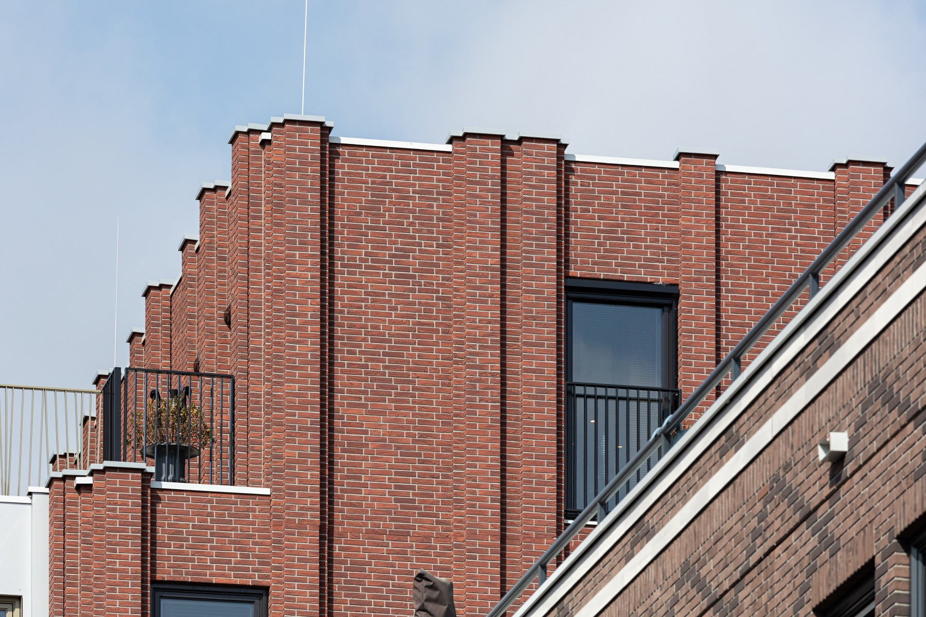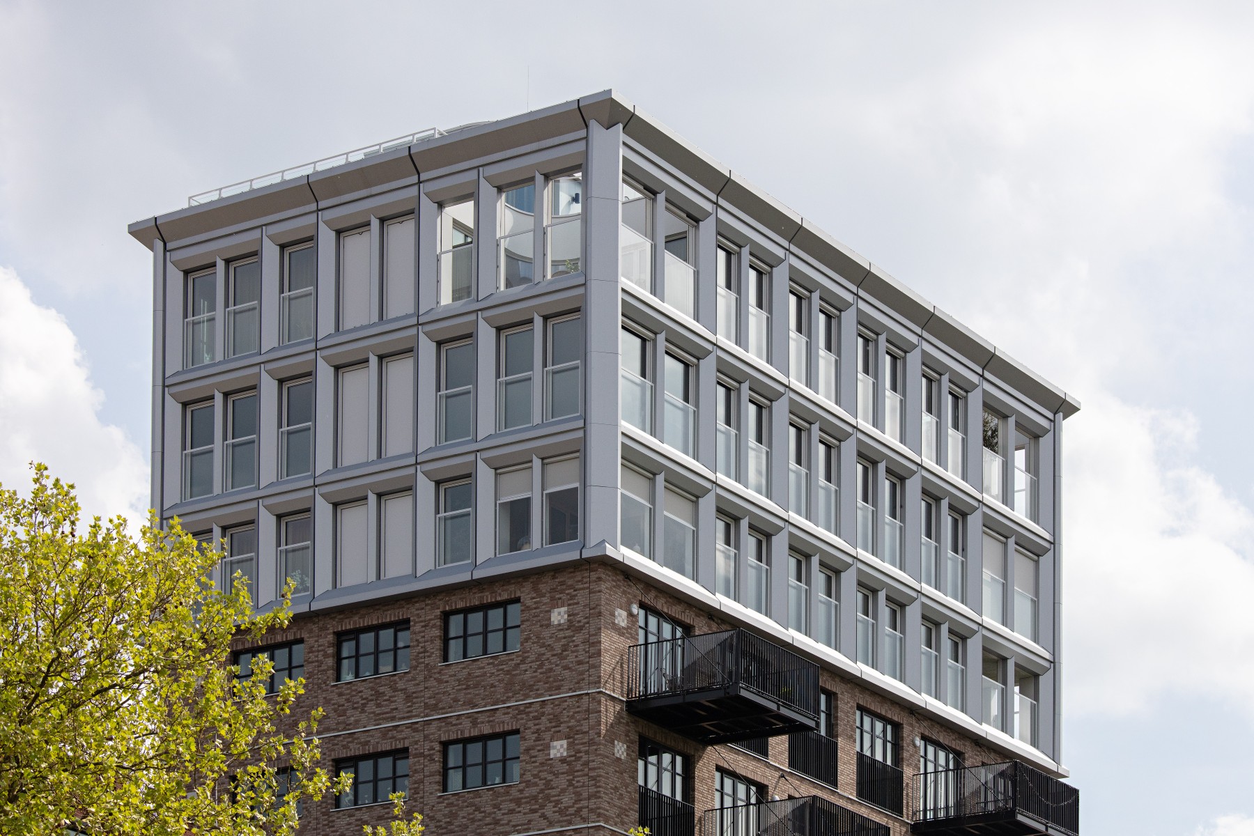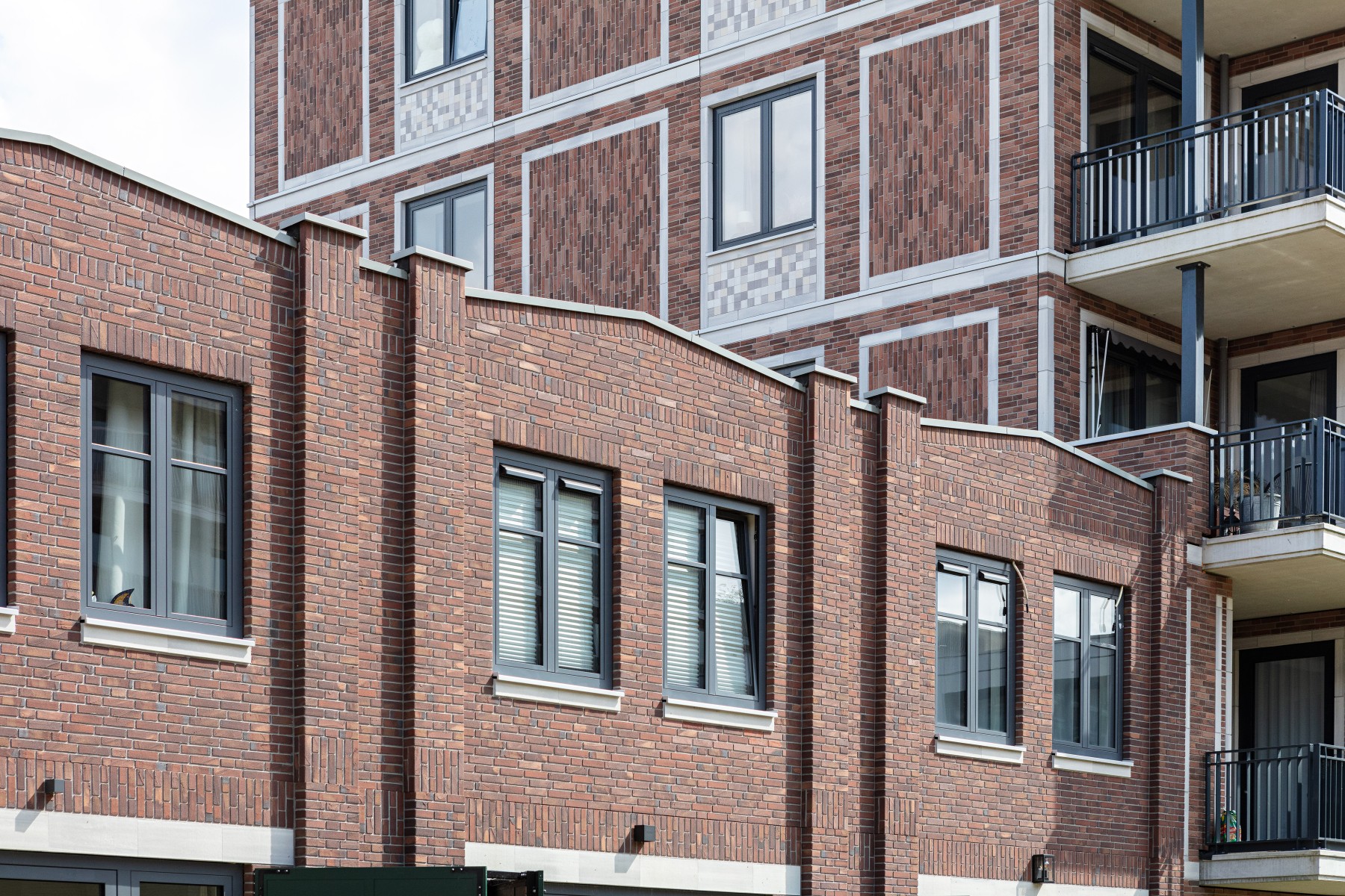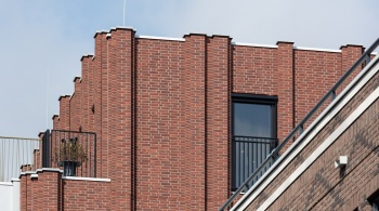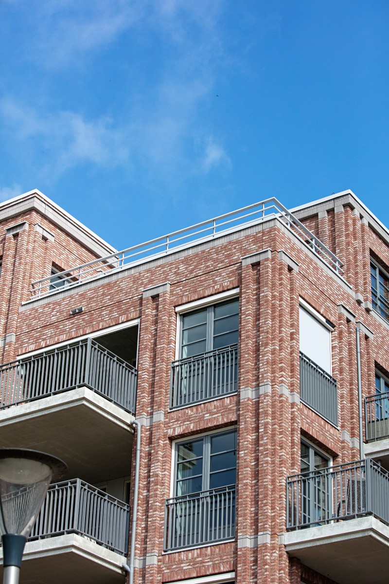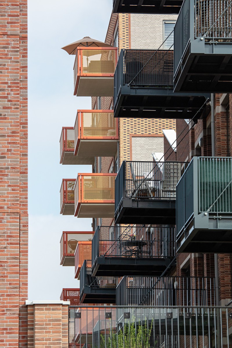 Pour les bavettes et les chaperons de mur, Joost a délibérément choisi l'aluminium en raison de la facilité avec laquelle le matériau peut être détaillé. Les chaperons de mur en aluminium sont pourvus de balustres avec garde-corps à certains endroits, parfois trois superposés. « Les chaperons de mur en aluminium assurent une finition soignée aux bords où les résidents se rapprochent, tels que les balcons et les terrasses sur le toit. Ici, l'aluminium n'est pas seulement esthétiquement attrayant, mais aussi pratique en raison de sa durabilité et de son entretien facile. De plus, cela nous a permis de créer une image d'architecture traditionnelle en béton d'une manière légère et innovante, adaptée à la méthode de construction à ossature bois », selon Verbeek. De plus, l'aluminium a aidé à camoufler les joints horizontaux entre les panneaux de façade. « Grâce à l'application astucieuse d'ouvrages en tôle d'aluminium, les joints disparaissent ça et là de manière ciblée dans le design. »