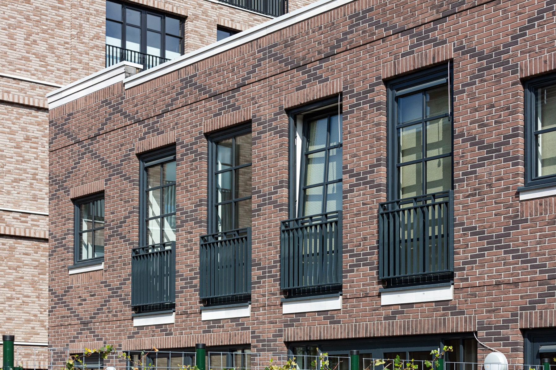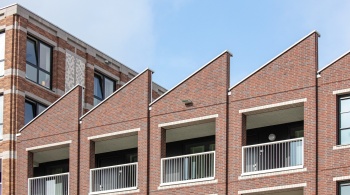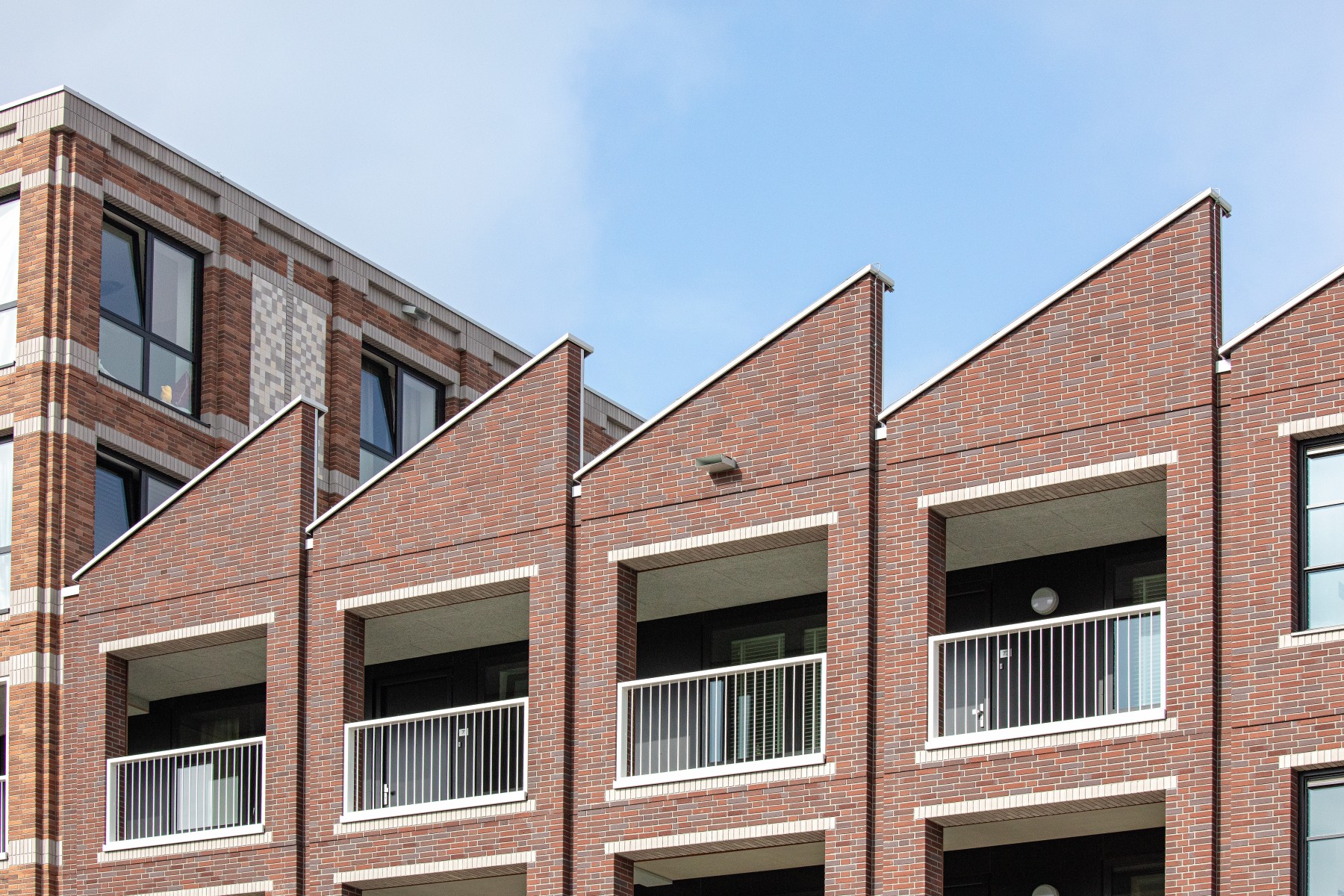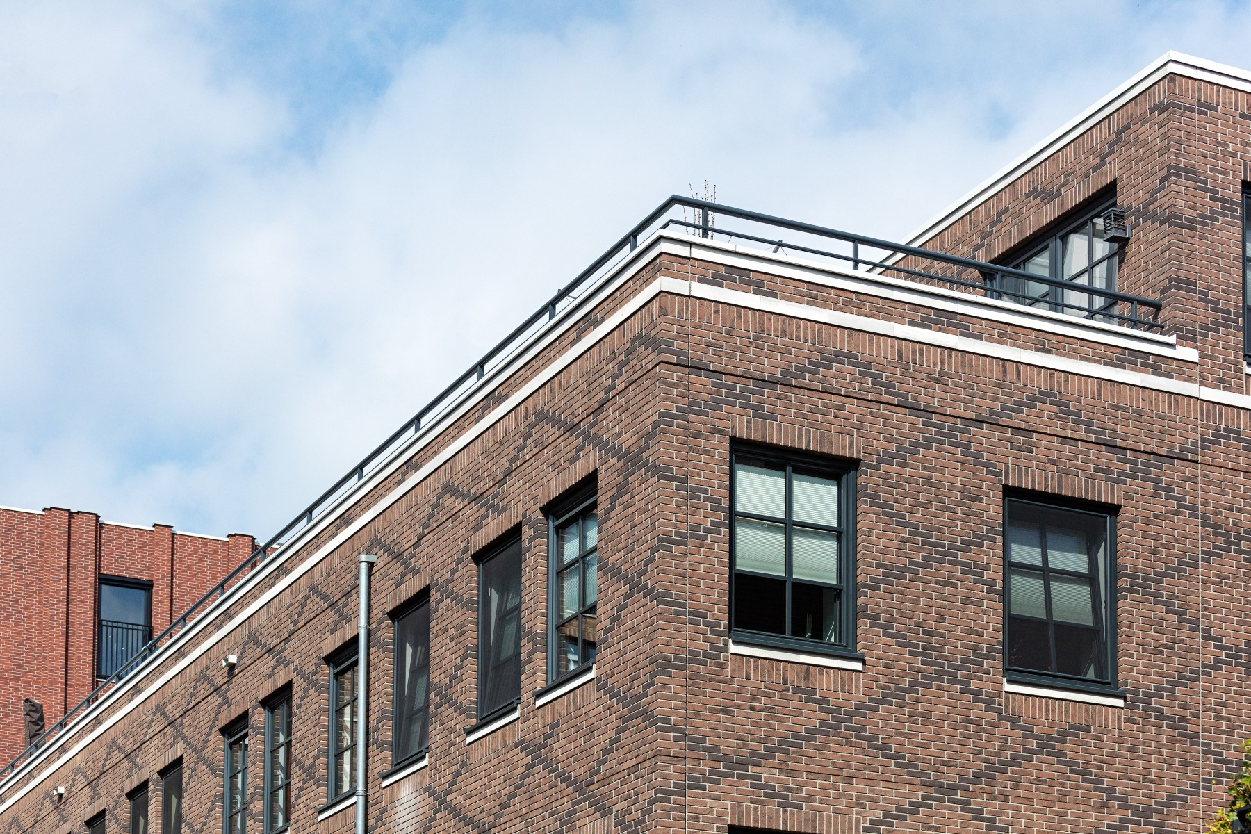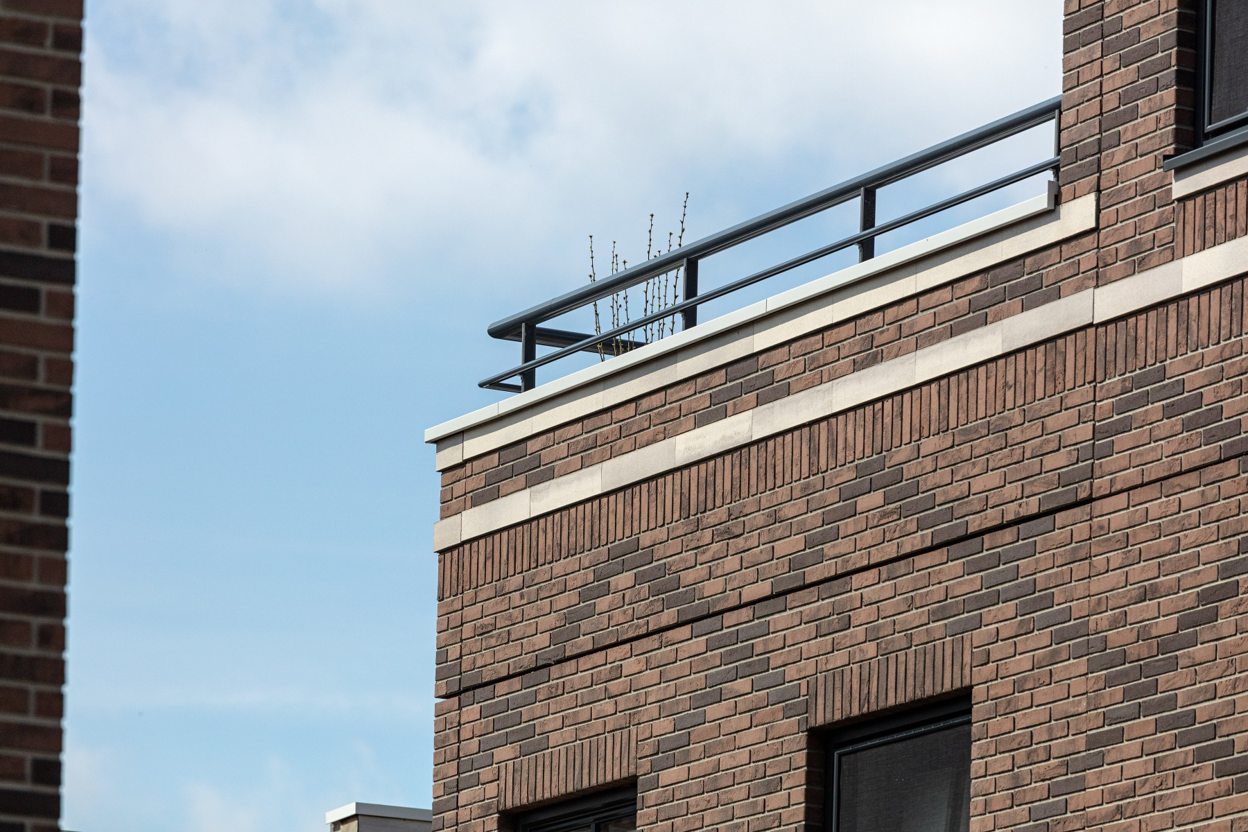 Pour les bavettes et les chaperons de mur, Joost a délibérément choisi l'aluminium en raison de la facilité avec laquelle le matériau peut être détaillé. Les chaperons de mur en aluminium sont pourvus de balustres avec garde-corps à certains endroits, parfois trois superposés. « Les chaperons de mur en aluminium assurent une finition soignée aux bords où les résidents se rapprochent, tels que les balcons et les terrasses sur le toit. Ici, l'aluminium n'est pas seulement esthétiquement attrayant, mais aussi pratique en raison de sa durabilité et de son entretien facile. De plus, cela nous a permis de créer une image d'architecture traditionnelle en béton d'une manière légère et innovante, adaptée à la méthode de construction à ossature bois », selon Verbeek. De plus, l'aluminium a aidé à camoufler les joints horizontaux entre les panneaux de façade. « Grâce à l'application astucieuse d'ouvrages en tôle d'aluminium, les joints disparaissent ça et là de manière ciblée dans le design. »