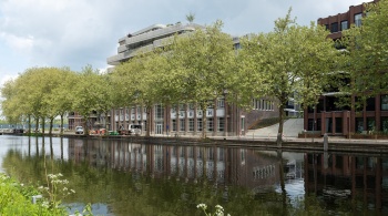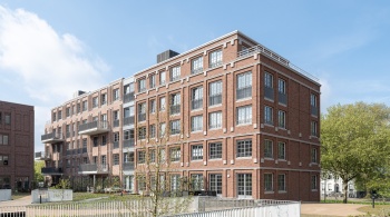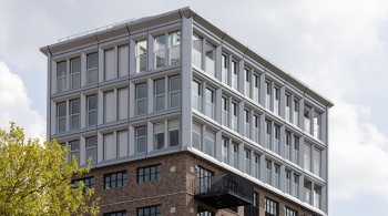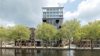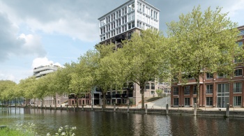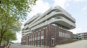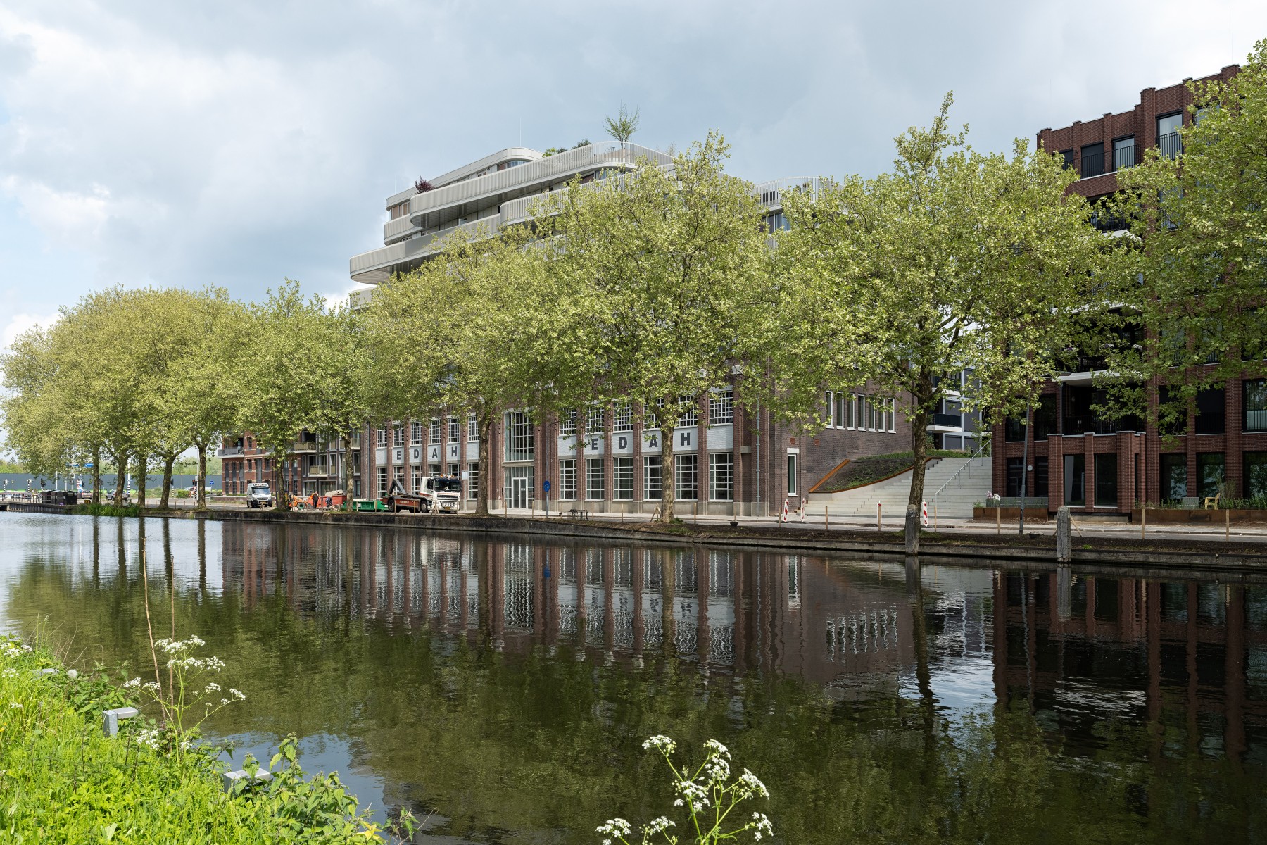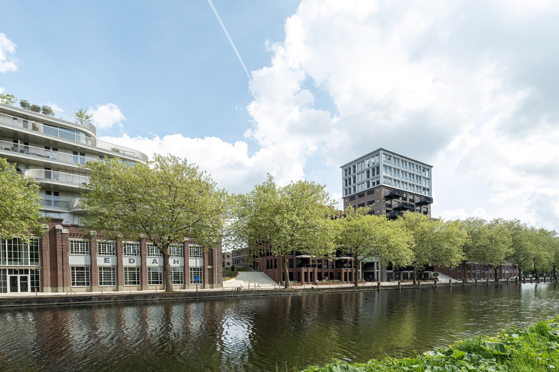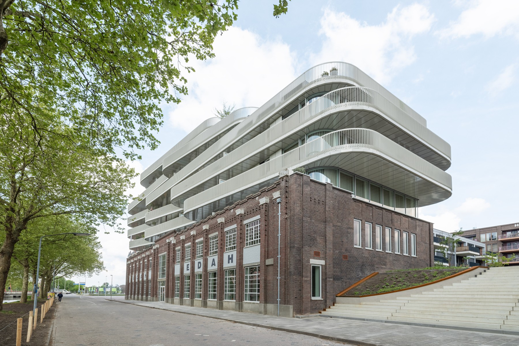 La façade monumentale du bâtiment EDAH lui-même a été soigneusement restaurée. L'ensemble du bâtiment est doté d'une surélévation moderne et frappante. « Les éléments historiques, tels que les encadrements de fenêtre, sont exécutés dans le caractère original en aluminium, tandis que nous voulions ajouter quelque chose de nouveau avec la surélévation », dit l'architecte. Les formes rondes de cet ajout, qui rappellent la proue d'un navire, sont inspirées par le canal voisin et le passé nautique du lieu. »