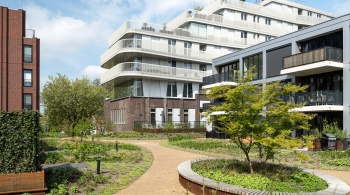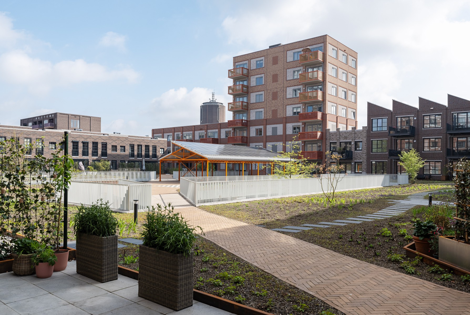 L'Oranjekade compte 269 logements, allant de petits appartements de 40 m² à de vastes logements de 200 m². Cela assure un public varié et renforce le sentiment d'appartenance à la communauté. Joost : « Nous voulions vraiment créer un quartier où les gens vivent ensemble. » Un détail frappant est les zones intérieures centrales, des jardins sur le toit sous lesquels se trouve le parking. L'un de ces jardins sur le toit a un auvent fait de fermes en treillis réutilisées provenant du bâtiment monumental. « Les résidents peuvent organiser des activités et se rencontrer ici, ce qui contribue à une communauté animée. »