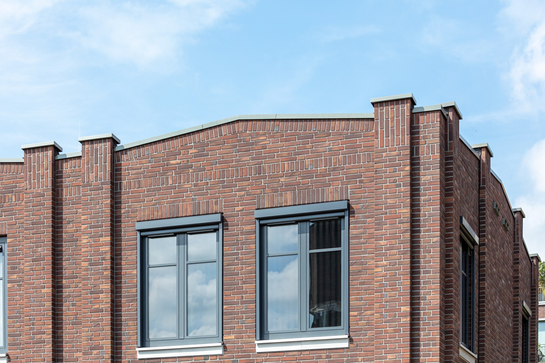 L'aluminium est crucial dans cette approche, en raison de son faible poids et de la possibilité de combiner ce matériau de manière transparente avec les systèmes de construction préfabriqués. « C'est précisément grâce au faible poids de l'aluminium que nous avons pu réaliser des applications détaillées qui s'harmonisent parfaitement avec les panneaux préfabriqués », explique Joost. Il mentionne spécifiquement les rives de toit, les bavettes, les chaperons de mur et les solutions sur mesure en aluminium. « Nous avons également choisi des encadrements de fenêtre et des portes en aluminium, car ils sont durables et très faciles d'entretien. »